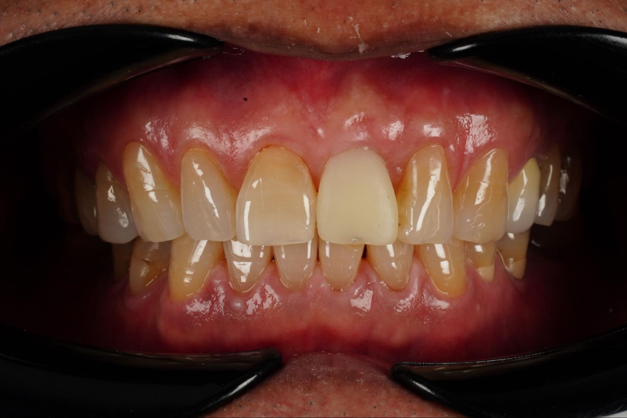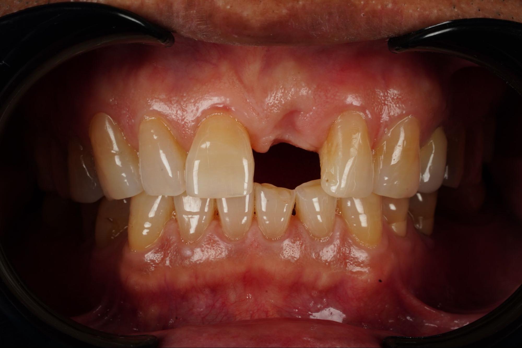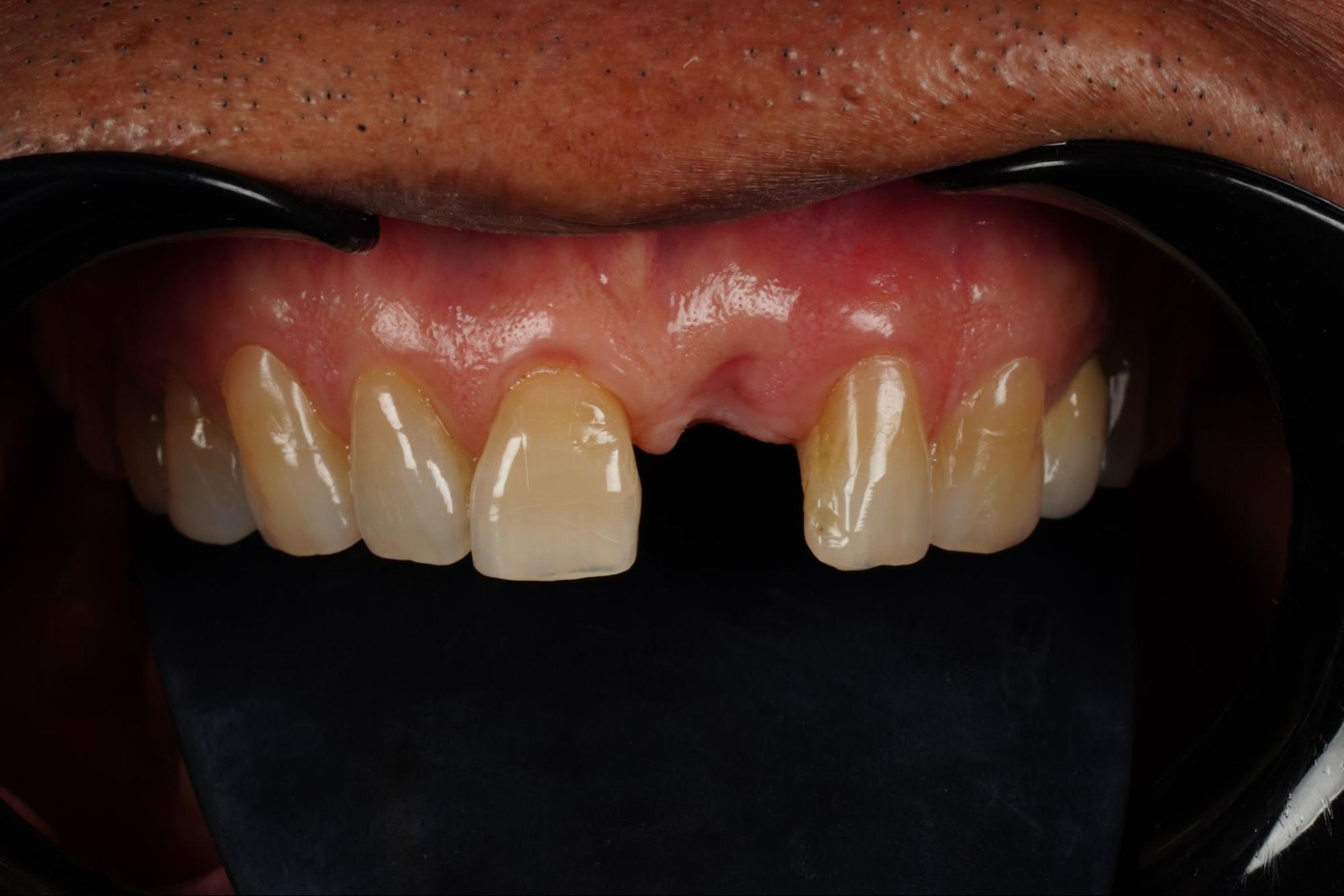 ผู้ป่วยมาด้วยอาการสำคัญคือได้รับอุบัติเหตุบริเวณฟันหน้าบนและฟันตัดกลางด้านซ้ายบนถูกกระแทกจนหลุดออกเมื่อ 4 เดือนที่แล้ว ปัจจุบันใส่ฟันปลอมชั่วคราว
