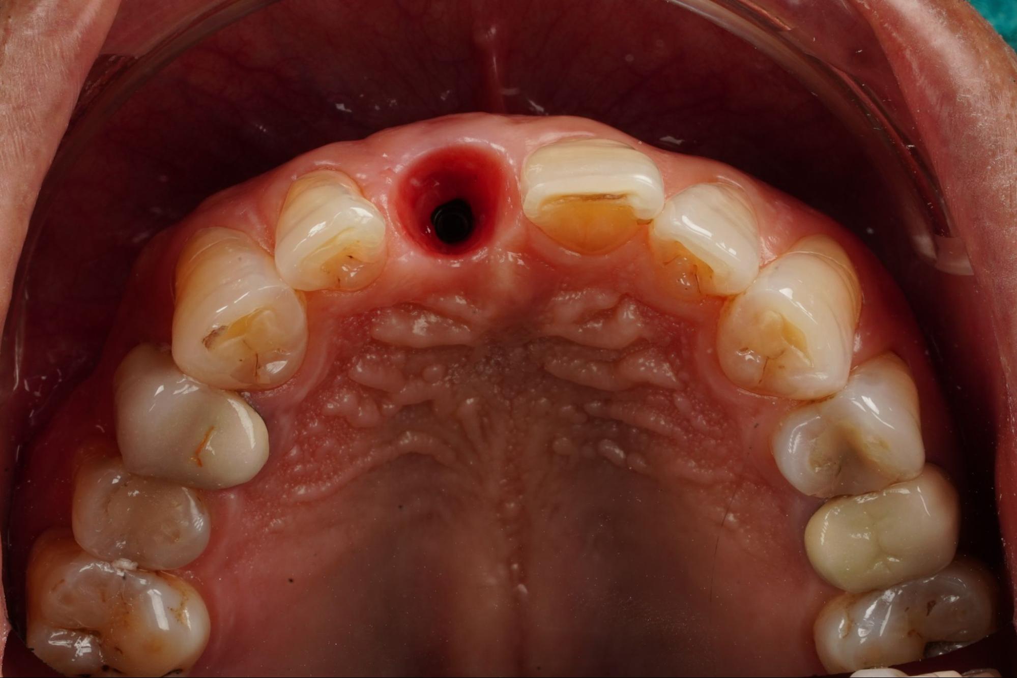 ขั้นตอนที่ 2: ผ่าตัดฝังรากฟันเทียมตำแหน่งซี่  21 โดยใช้แนวนำทาง 3 มิติ จากนั้นปลูกกระดูกเสริมและใส่ครอบฟันชั่วคราวที่เตรียมไว้ในห้องปฏิบัติการ